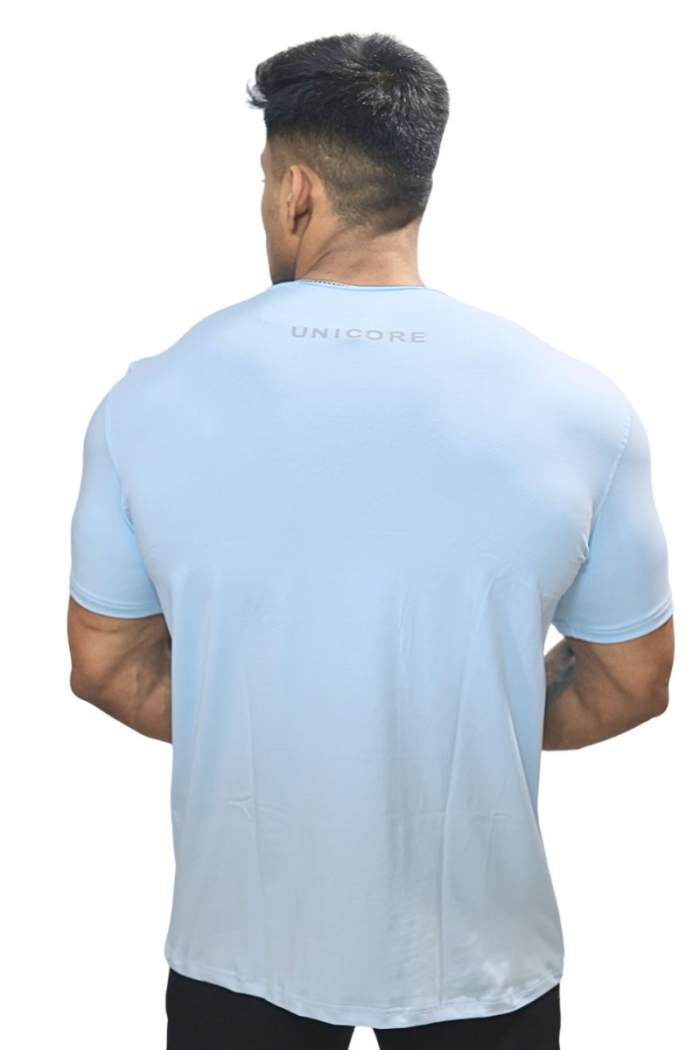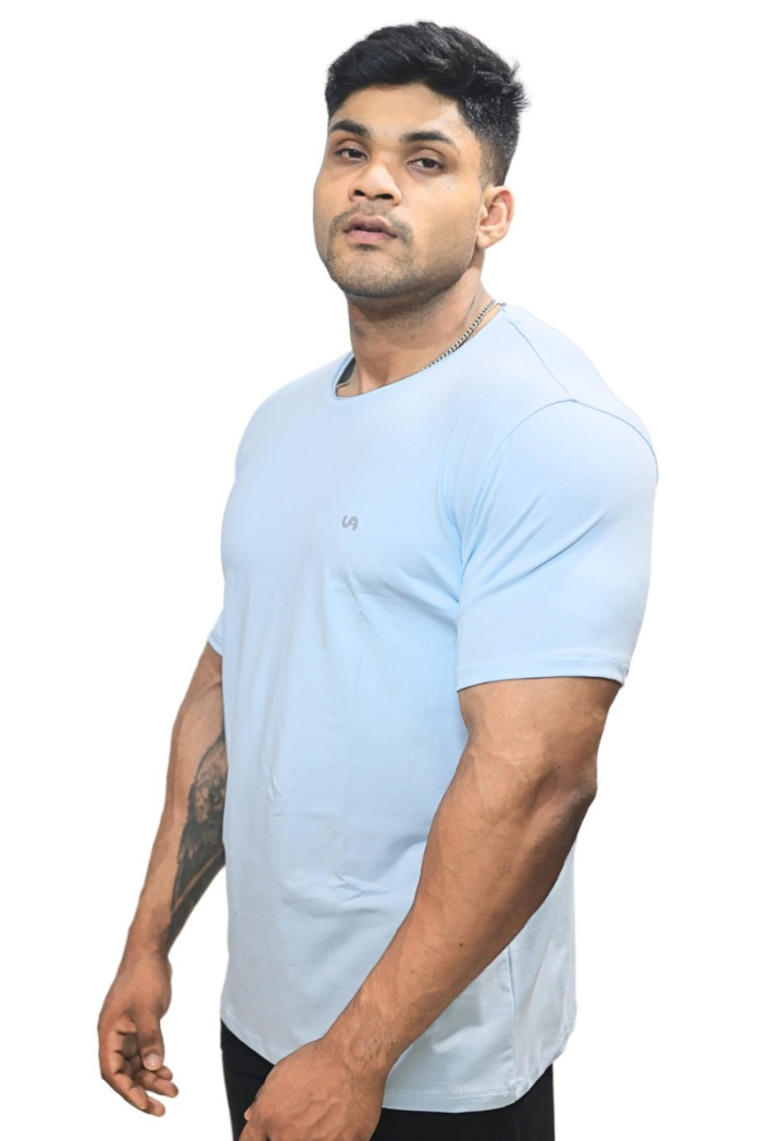 The sky blue shade brings personality without limiting your styling options. Pair it with dark denim for timeless casual appeal, throw it on with joggers for athleisure vibes, or layer it under a jacket when temperatures drop. This tee is that rare piece that works for literally everything—gym sessions, casual hangouts, coffee runs, or Netflix marathons.